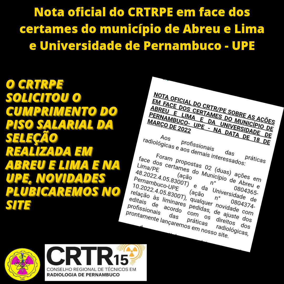 O CRTRPE Solicitou o cumprimento do piso salarial, referente aos certames de Abreu e Lima e UPE22 de março de 2022Nota de Pesar – Rodrigo Ferreira da Paz26 de março de 2022 Show all É com profundo pesar, que o CRTRPE anuncia o falecimento de Tamyris Ramos. Nós solidarizamos com a família, nesta profunda dor, que Deus conforte a família. Share2 Related posts27 de maio de 2024CRTRPE Consegue liminar contra o município de Taquaritinga do NorteRead more2 de janeiro de 2024Edital de Convocação 009 -2023Read more6 de dezembro de 2023Edital de convocação 007-2023Read more6 de dezembro de 2023Edital de Convocação 006-2023Read more